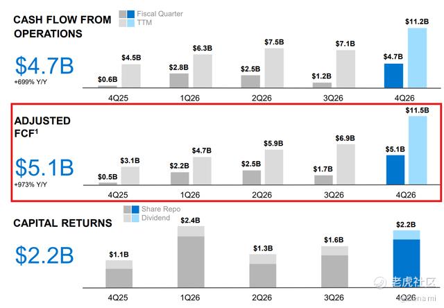 现金流的表现更是亮眼,成为本次财报的另一大亮点。戴尔第四季度经营活动现金流47亿美元,自由现金流达39.5亿美元,调整后自由现金流更是飙升至51亿美元,较上年同期增长10倍,自由现金流利润率也提升至11.8%。现金流的大幅改善,源于戴尔向高利润率数据中心业务的转型,也为公司回馈股东、持续研发提供了坚实基础——戴尔已宣布现金股利增长20%,并增加100亿美元股票回购授权额度。