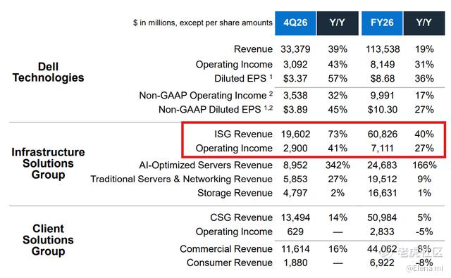 戴尔2026财年第四季度的财报,堪称AI硬件领域的“天花板级”表现,各项核心数据全面超预期,基础设施解决方案集团(ISG)的AI服务器业务更是成为绝对的增长引擎。