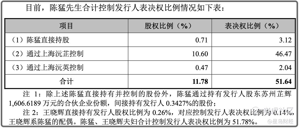 通过特别表决权架构,陈猛直接及间接控制公司51.64%的表决权,系公司的实际控制人。这种机制在保障了决策效率的同时,也埋下了中小股东权益旁落的隐患。另外,总裁办员工王晓辉直接持有发行人股权比例为0.26%,对应控制发行人表决权比例为0.14%,而王晓辉是陈猛的配偶,即陈猛、王晓辉夫妇合计控制发行人表决权比例为51.78%。