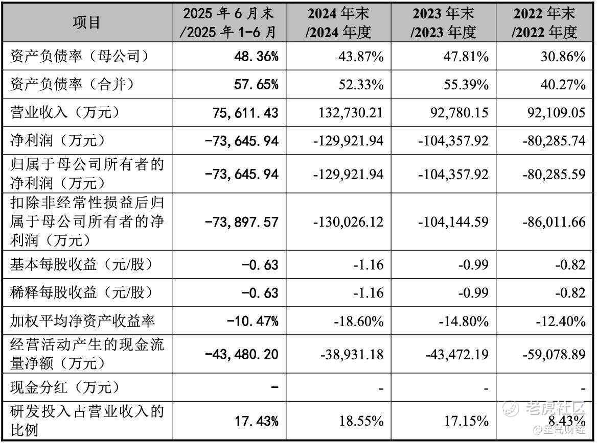 招股书信息显示,2022年—2024年,公司的营业收入呈现持续增长趋势,从9.21亿元上涨至13.27亿元,然而归母净亏损却从8.03亿元扩大到了12.99亿元,三年累计亏损31.46亿元。2025年上半年,公司亏损势头未改,归母净亏损达7.36亿元,三年半时间累计亏损超38亿元。
