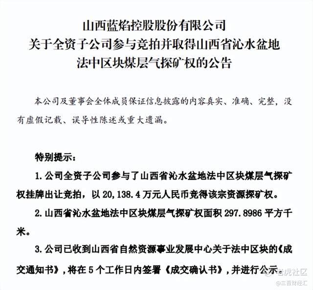 3月5日,山西A股上市公司蓝焰控股(000968.SZ)发布公告,其全资子公司山西蓝焰煤层气集团有限责任公司(以下简称“蓝焰煤层气”)已正式取得山西省沁水盆地法中区块的煤层气探矿权证。