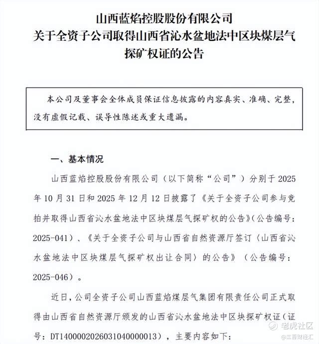 2025年9月,山西省自然资源厅发布该区块探矿权挂牌出让公告,起始价238.4万元。同年10月,蓝焰煤层气以2.01亿元的价格成功竞得。12月,蓝焰煤层气与省自然资源厅正式签署《探矿权出让合同》,直至此次探矿权证落地,项目开发步入实质性阶段。