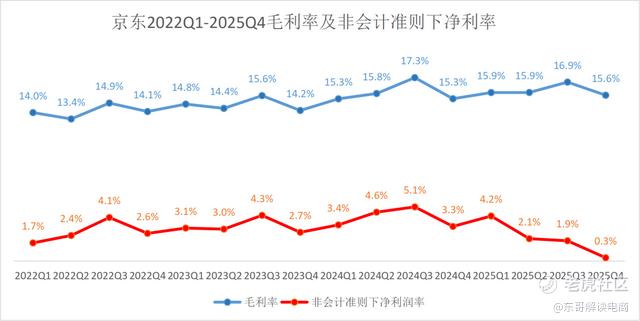 Q4净收入为3523亿元,同比增长1.5%;归属于公司普通股股东的净利润率为负0.8%,2024年Q4为2.8%。京东2025年营收13091亿元,同比增长13.0%;净利润196亿元,归属于公司普通股股东的净利润率为1.5%,2024年为3.6%。
