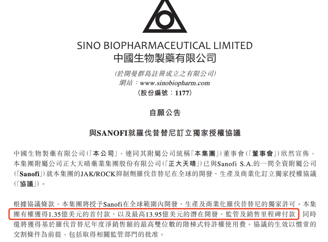 就在昨天早盘,中国生物制药发布一则涉及15.3亿美元重磅BD的公告,将全球首创(First-in-class)的新型强效口服小分子JAK/ROCK抑制剂罗伐昔替尼的全球权益授予赛诺菲,中国生物医药将获得1.35亿美元的首付款,以及最高13.95亿美元的潜在开发、监管及销售里程碑付款,以及基于销售额的双位数特许权使用费。