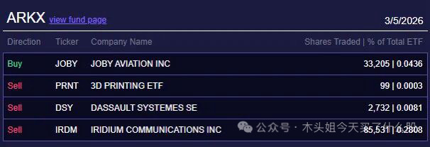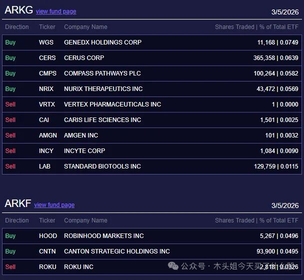 木头姐今天买入1500万美元HOOD、210万美元WGS、120万美元CERS、90万美元JOBY、150万美元DKNG、68万美元CMPS、66万美元NRIX、42万美元CNTN。