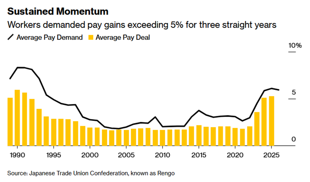 3、根据日本劳动组合总联合会(Rengo)的数据,其成员工会2026年平均薪资增长要求为5.94%,与前一年的6.09%基本持平,这标志着薪资增长诉求已连续第三年维持在5%以上的高位。这一持续强劲的加薪势头是日本央行决定是否继续推进政策正常化的关键观察指标,谈判的最终结果将直接影响其未来的利率决策。此前企业达成的薪资协议虽创下三十多年来的新高,但未能完全抵消通胀,导致2025年实际工资持续同比下降。