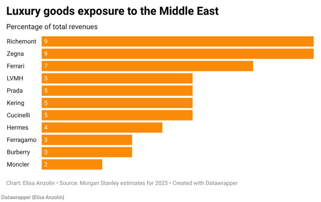 9、由于伊朗冲突导致迪拜等关键空域关闭,阻断了这一占全球奢侈品销售5%-6%的市场客流。摩根士丹利数据显示,历峰集团与杰尼亚因该区域营收占比达9%而风险敞口最大;斯托克欧洲奢侈品指数两日内暴跌约9%,创下4月关税冲击以来的最大跌幅。