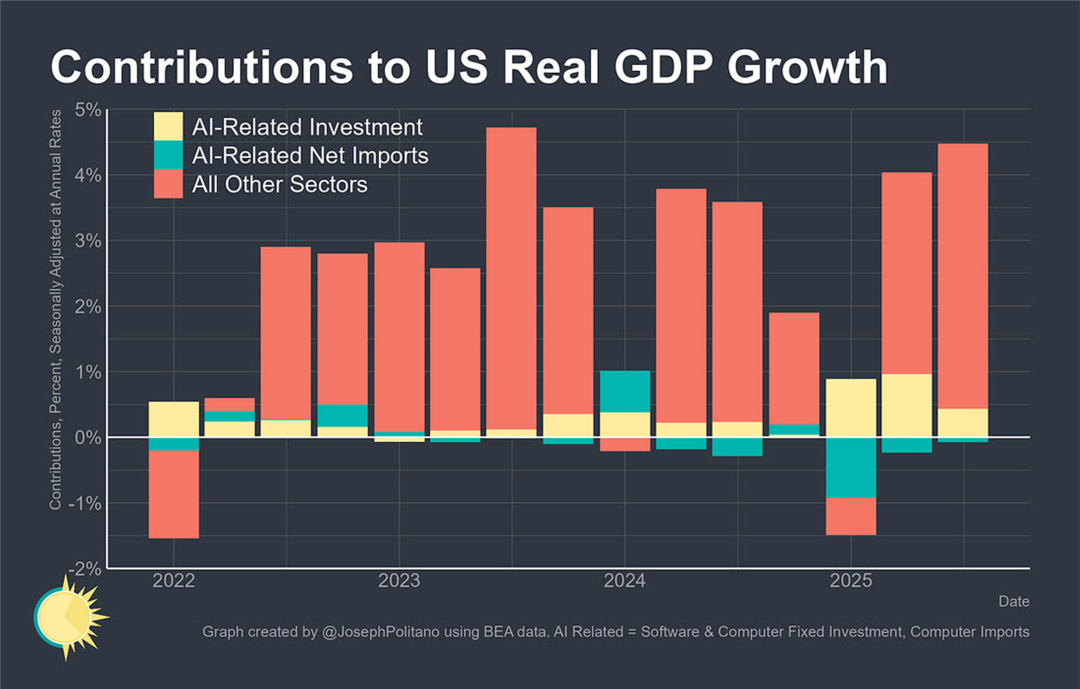 6、由于人工智能硬件投资严重依赖进口,其对美国GDP的短期提振作用有限。在去年第三季度4.4%的年化GDP增长中,扣除进口后的AI相关投资净贡献仅为0.3个百分点,大部分增长效益流向了海外电子制造商。
