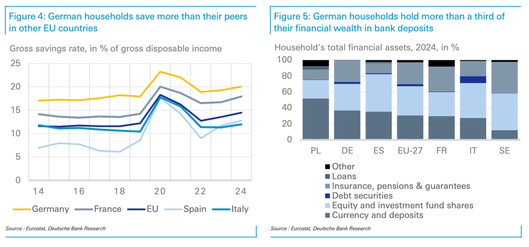 4、2024年,德国的家庭总储蓄率占可支配收入的比例达到20%,显著高于13.2%的欧盟平均水平。其家庭金融资产的配置高度集中于银行存款与保险产品,这两项低收益资产合计占总金融财富的三分之一以上。这种保守的资产结构导致德国的整体财富积累效率不高,其家庭金融资产总额仅为GDP的209%,低于欧盟214%的均值,也远不及瑞典(347%)或丹麦(369%)等股权投资占比较高的经济体。