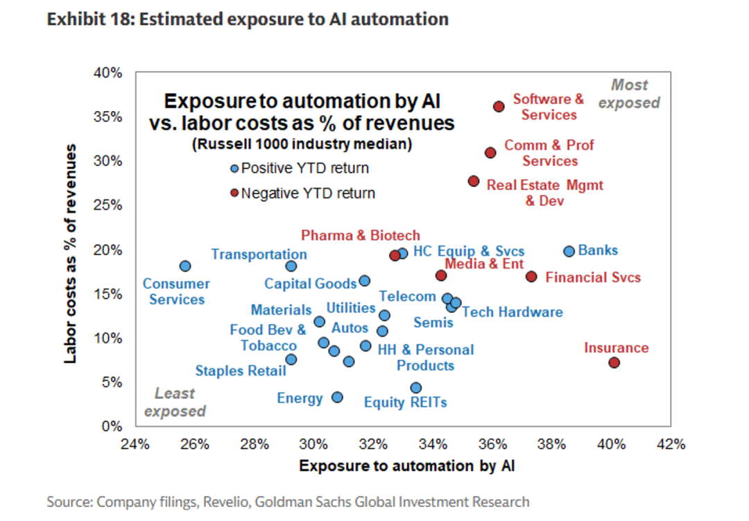 9、从行业层面看,人工智能的颠覆风险主要集中于劳动力成本高、且易受自动化影响的领域。这些风险最高的行业,例如软件与服务、房地产管理等,其年初至今的股票回报率也普遍为负。