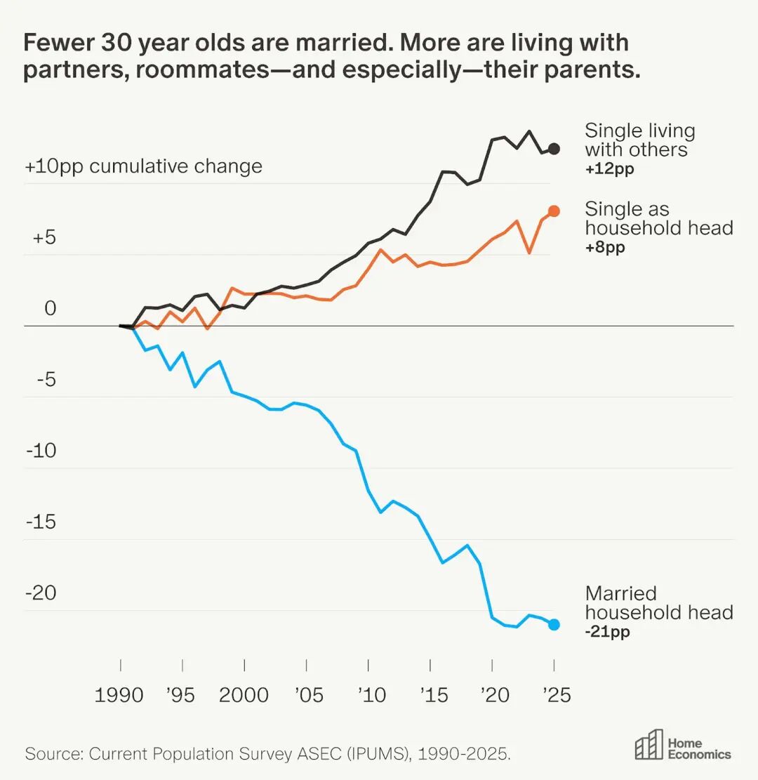 5、1990年至2025年间,美国30岁人群中与父母或室友同住的比例从17%增至32%,该群体是同期同龄人住房拥有率下降15个百分点的关键因素。相比之下,已婚30岁人群的住房拥有率保持稳定,从63%微降至60%,而独立居住的单身人士拥有率则从25%升至29%。与父母同住的30岁人群画像主要是未婚(占89%)、男性(占61%)且未获得大学学位(占73%)。这一变化的核心在于,未受过大学教育的男性结婚率从58%大幅降至36%,而在1990年代,该群体通常会通过结婚搬离原生家庭。
