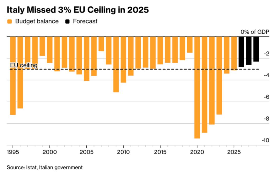 8、意大利国家统计局Istat公布的初步数据显示,该国2025年预算赤字占GDP的3.1%,意外突破了欧盟3%的上限。官方将此归因于前政府时期推出的“超级补贴”(superbonus)政策,即一项旨在刺激经济的住房翻新税收抵免计划,其财政影响仍在持续。同批数据显示,意大利公共债务占GDP比重也升至137.1%,为三年来最高水平。