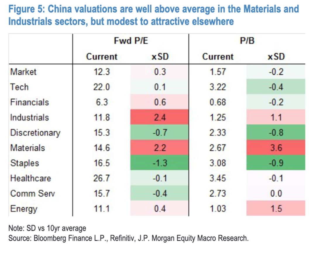 7、中国股市各板块估值分化显著,材料与工业板块目前大幅溢价,其中材料业市净率较十年均值高出3.6个标准差,工业市盈率偏离值亦达2.4;相比之下必选消费板块估值低至均值下方1.3个标准差,科技与可选消费等板块则处于历史均值或折价区间。