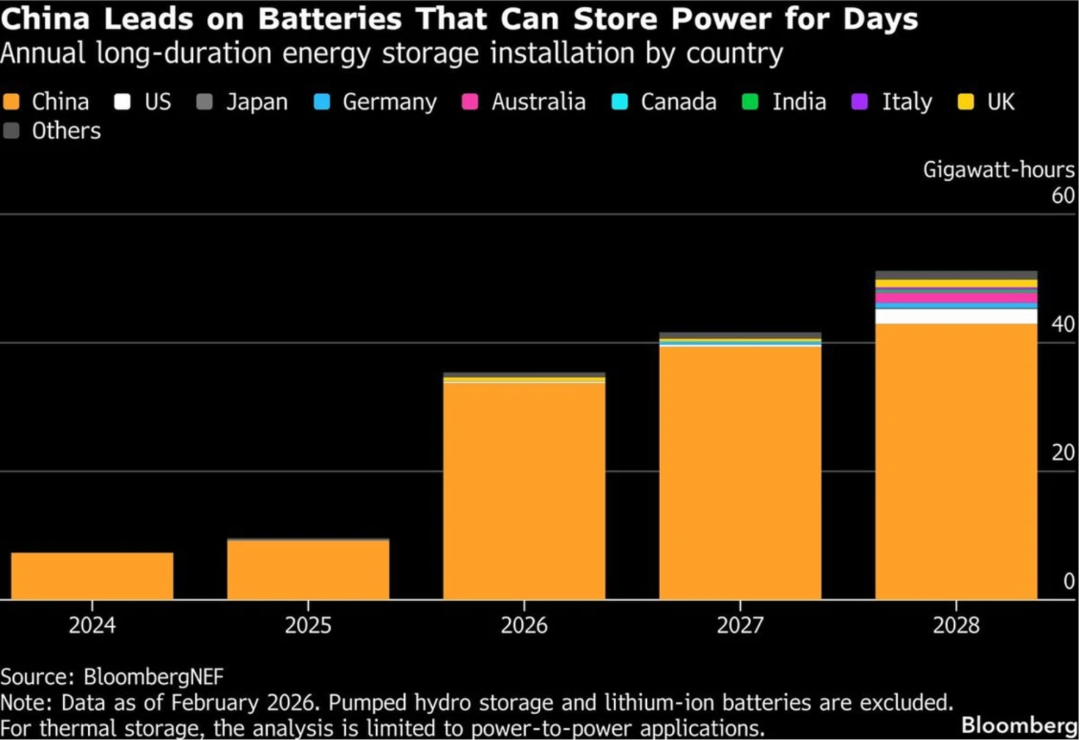 2、中国正在长时储能这一新兴能源技术领域建立起绝对主导地位,该技术能够储存并释放长达数小时乃至数天的电力,对于平抑间歇性可再生能源的波动至关重要。2025年,全球新增了创纪录的9.6吉瓦时长时储能容量,其中几乎所有项目均由中国建成。这一爆发式增长源于中国强有力的政策推动,自2023年将长时储能确定为实现净零排放的关键技术后,监管机构于2024年随即启动了56个试点项目,直接催生了当前的建设热潮。展望未来,全球已规划的长时储能项目总容量高达422吉瓦时,其中高达95%的份额计划在中国落地,使美国以仅占2%的规划容量远远落后,成为第二名。