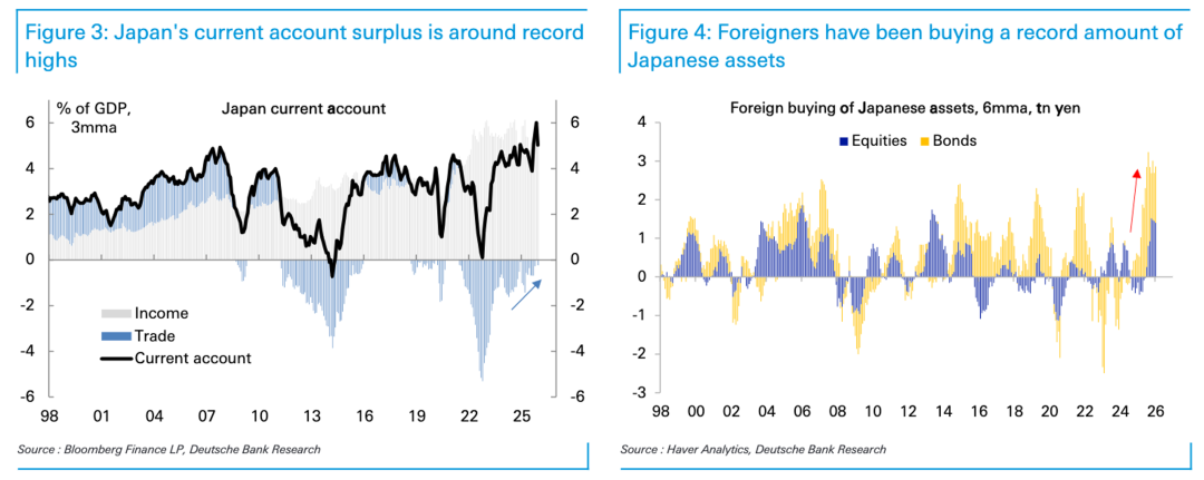1、在初次收入盈余的强力支撑下,即便贸易账户持续录得逆差,日本的经常账户顺差仍触及占GDP超过5%的历史高位。这种庞大的外部盈余与日元汇率的疲软态势并存,显著提升了日本资产对外国投资者的吸引力。过去一年内,外国投资者对日本证券的购买量已创下历史纪录,其中对债券与股票的净买入均大幅增加,截至2026年初,其六个月移动平均购买总额已接近3万亿日元。