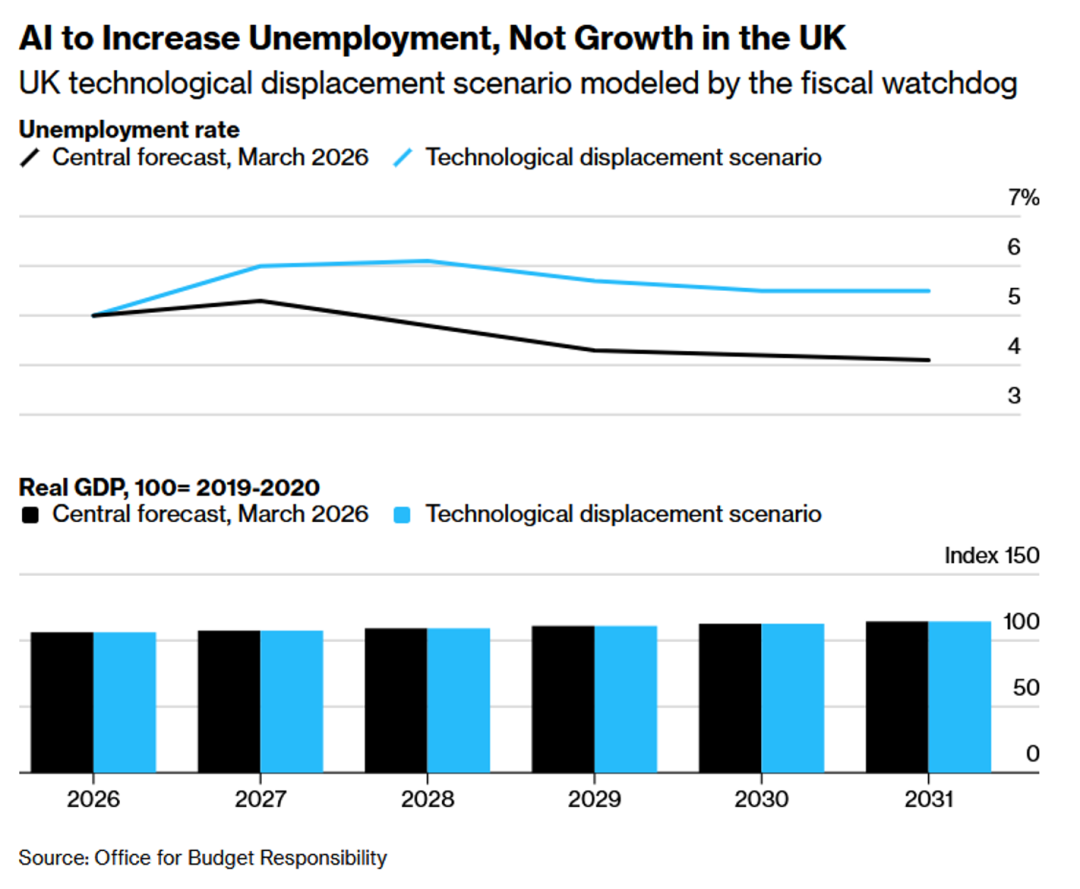 7、根据英国预算责任办公室(OBR)的一项分析,人工智能的应用可能在未能提振英国经济增长的同时,推高失业水平。在其模拟的“技术性替代”情景中,均衡失业率预计将上升至5.5%,比核心预测高出超过一个百分点;尽管新技术将提高在职员工的生产率,但这部分收益会被整体就业人数的下降所完全抵消,最终对GDP无实际贡献。此情景将对公共财政构成压力,预计每年福利支出将增加30亿英镑,同时税收收入因就业和消费贡献降低而减少60亿英镑,导致政府年度借款额增加90亿英镑。