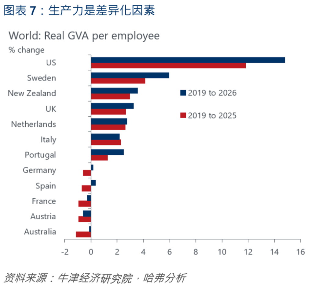 2、美国劳动生产率的增长已显著超越其他发达经济体,估计从2019至2026年,其每名雇员的实际总增加值将增长近15%,而同期德国、法国等欧洲主要经济体则徘徊在零增长附近。这一差距的扩大主要源于美国过去对知识产权的投资回报正在显现、持续强劲的企业研发投入以及更高的商业活力,而非人工智能的直接贡献。此外,人口结构也是关键的分化因素,欧洲更为老龄化的劳动力及其相对较低的年轻劳动力参与率,对生产率增长构成了结构性制约。