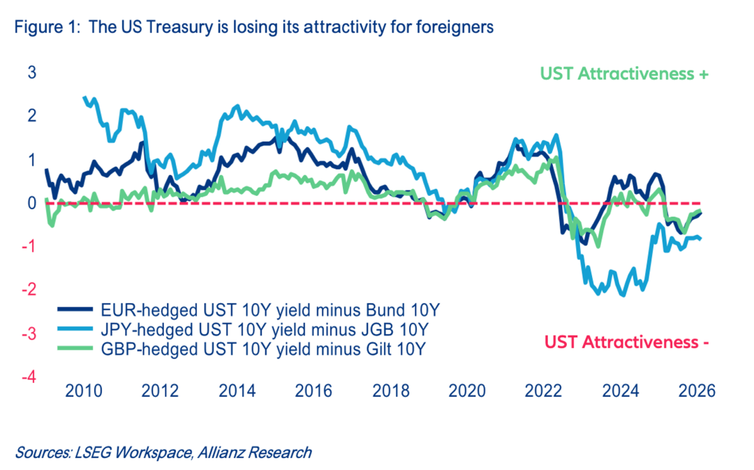 评论:其实就是08年以后美债发行量增加,但外国央行吸收能力有限,于是美债的持有者来自全球对冲基金增多,因为买入美债后在回购市场抵押可以获得更低成本的杠杆去套利;但现在一方面经汇率对冲后的美债相对利差显著收窄(如图所示),削弱了套利吸引力;另一方面,美国将金融工具政治化(如制裁、关税胁迫),动摇了美债作为“无风险资产”的制度基础。结果就是:交易型投资者因性价比下降而减少配置,长期投资者因信任受损而寻求替代资产,共同推动全球货币体系向去美元化方向演进。