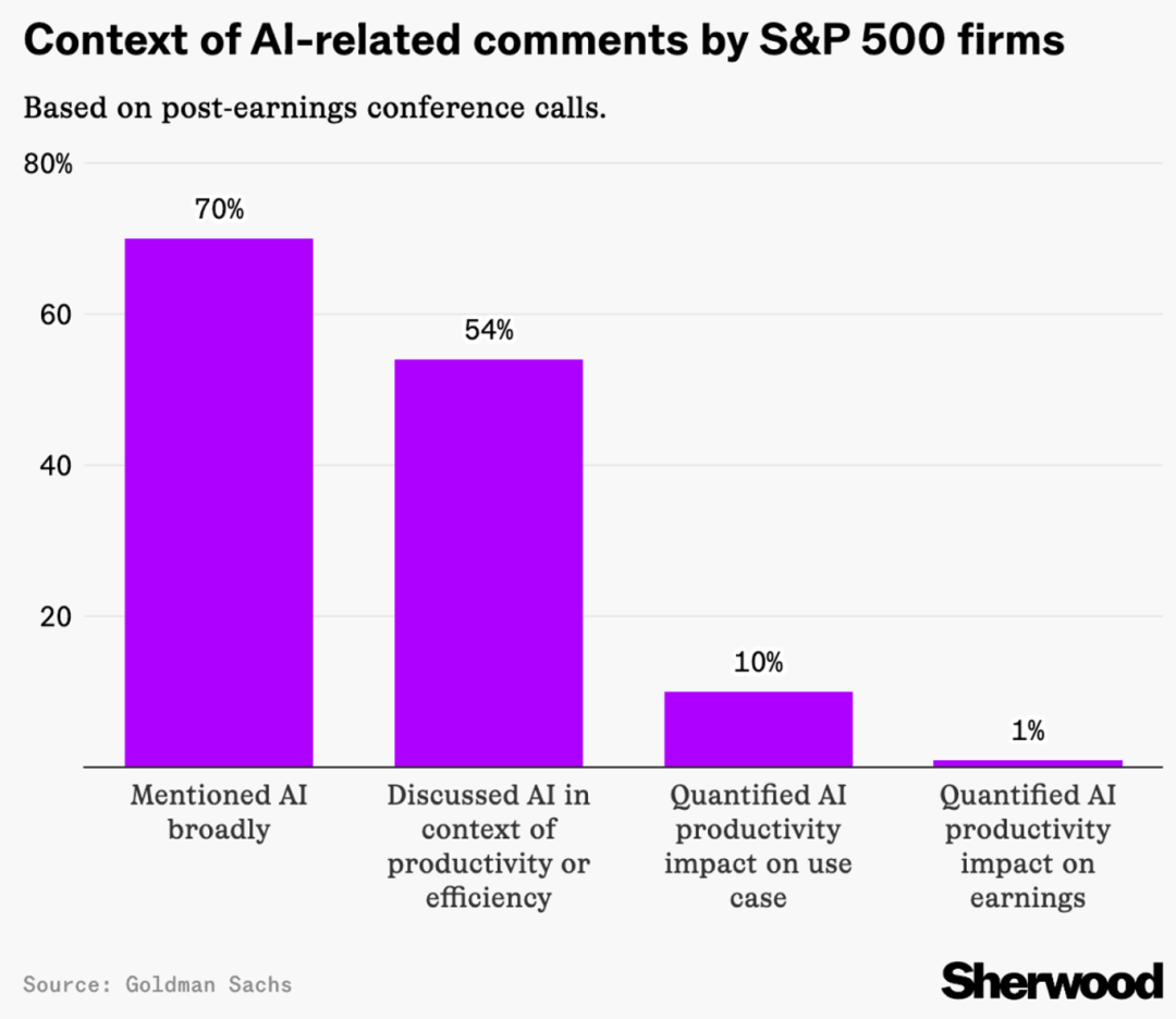 8、在标普500公司的财报会议中,人工智能虽被广泛讨论,但具体财务影响的披露却极为有限。尽管70%的公司提及AI,54%讨论其对效率的提升,但仅有10%量化了其在特定应用中的生产力影响,而能量化其对最终盈利贡献的公司更是只有1%。
