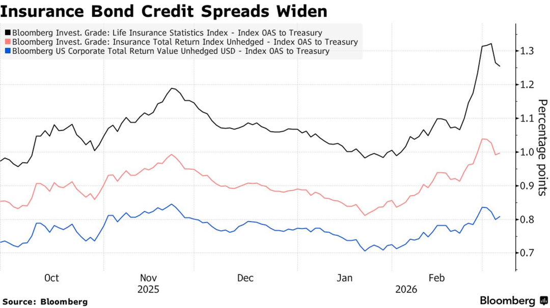 11、美国投资级寿险公司债券的信用利差,因市场对其私募信贷风险敞口的担忧而急剧扩大,其相对于国债的期权调整利差(OAS)一度飙升至132个基点的近期高位。市场的主要忧虑集中在寿险公司成为私募信贷风险的传导渠道,以及它们与另类资产管理公司之间日益紧密的股权和分销关系。然而,高盛认为此轮抛售反应过度,其对具代表性的寿险公司资产负债表的审查发现,另类资产的配置中位数仅为6%,且披露的私募证券更接近于标准化的144A私募配售债券,而非真正难以定价的高风险工具。