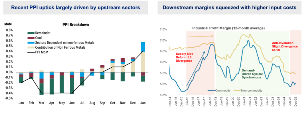 4、摩根士丹利表示,中国近期工业生产者出厂价格(PPI)的回升主要由有色金属和煤炭等上游行业驱动,这直接推高了下游行业的投入成本。同时,下游行业因面临激烈的“内卷式”竞争,其利润空间受到双重挤压。这已导致工业利润出现分化,即上游大宗商品行业的利润表现与下游非大宗商品行业出现背离。