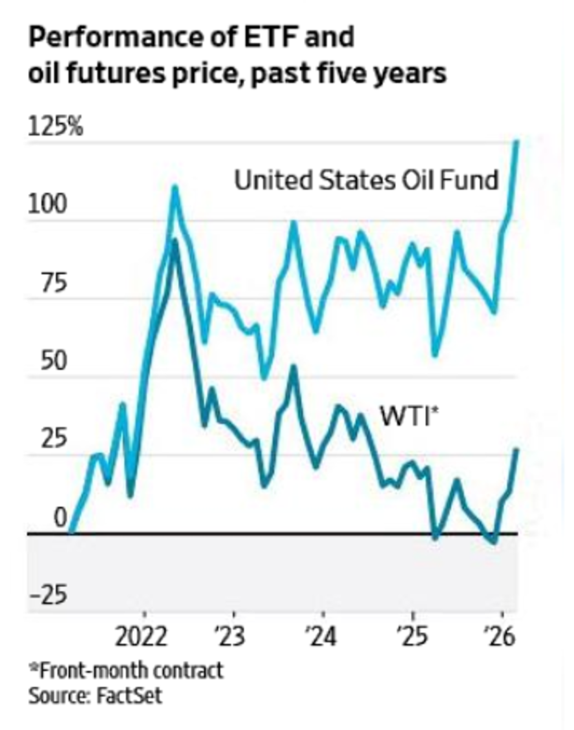 3、美国联合原油基金ETF(USO)在过去五年中的表现已显著偏离其追踪的商品本身,该基金价值翻倍有余,而同期美国基准原油期货(WTI)仅上涨18%。这种超额收益主要源于两个因素:基金持有的现金余额所产生的高额利息收入,以及更为关键的原油期货市场持续存在的贴水结构。由于USO通过持有期货合约而非实物原油来追踪油价,它必须定期卖出即将到期的近月合约并买入远月合约。在贴水市场中,远月合约价格低于近月合约,这一展期操作能为基金带来正向收益。这种由地缘政治供应风险和对欧佩克增产预期共同驱动的贴水状态,在过去五年中的四年里占据了至少80%的交易时间。该基金的业绩对期货曲线结构极为敏感,例如在升水(即远月合约更贵)的市场环境下,展期操作会产生亏损,一个极端案例是2020年,当时的市场导致USO全年亏损68%,远超WTI期货21%的跌幅。