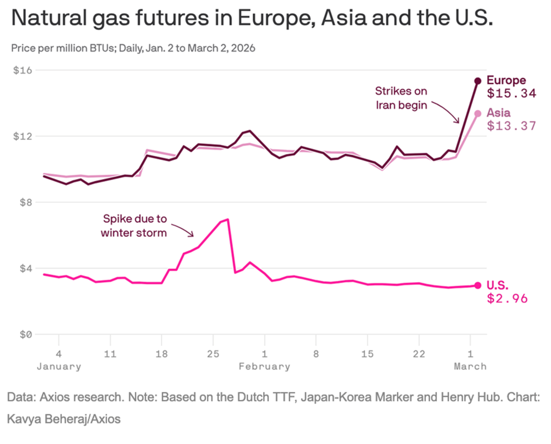 1、因伊朗遭受军事打击,欧洲和亚洲的天然气期货价格分别飙升至每百万英热单位15.34美元和13.37美元。同期,美国亨利港的天然气期货价格仅为2.96美元,基本未受影响。这种价格稳定性源于美国作为全球最大天然气生产国和液化天然气出口国的地位,其庞大的国内产量形成了缓冲。此外,与全球一体化的石油市场不同,天然气市场仍具较强的区域性,进一步隔离了美国免受海外供应中断的冲击。