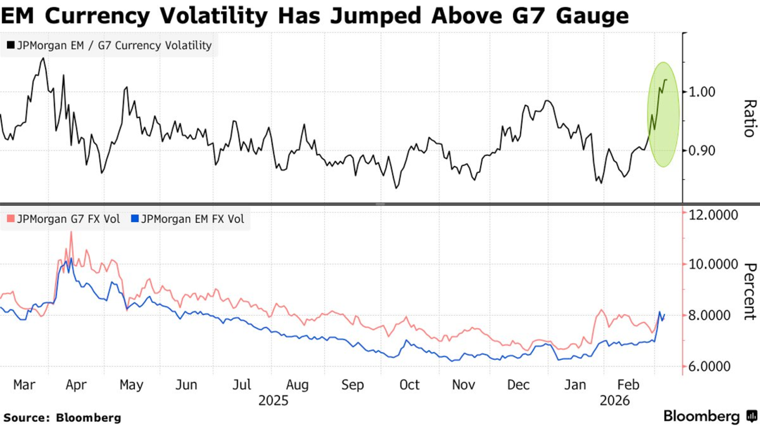 1、由于中东军事冲突引发霍尔木兹海峡航运中断,美国WTI原油价格录得创纪录的单周涨幅,这一能源价格冲击直接导致新兴市场资产经历了自2020年3月新冠疫情爆发以来最差的一周表现。MSCI新兴市场货币指数周跌幅达1.5%,而股票指数自冲突开始以来已下跌近7%。市场的剧烈动荡也体现在外汇波动率上,摩根大通新兴市场外汇波动率指数在长期低于七国集团(G7)波动率水平之后,本周已急剧飙升并反超后者。这一结构性转变迫使新兴市场央行采取干预措施,其中土耳其央行在一周内动用了约120亿美元(占其外汇储备的15%)以稳定里拉,菲律宾央行亦警告称若油价触及100美元,可能将被迫收紧货币政策。