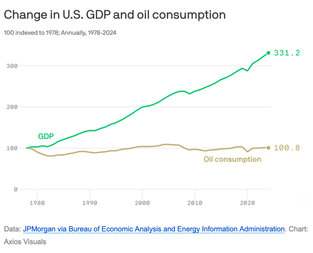 2、过去半个世纪,美国经济规模增长了三倍,然而石油消费几乎没有增长。这种结构性转变主要源于汽车燃油效率的提高、廉价天然气在家庭供暖等领域对石油的替代效应,以及可再生能源应用的增加。得益于此,美国经济在面对地缘政治引发的供应中断时,抵御冲击的能力已强于1979年石油危机时期。