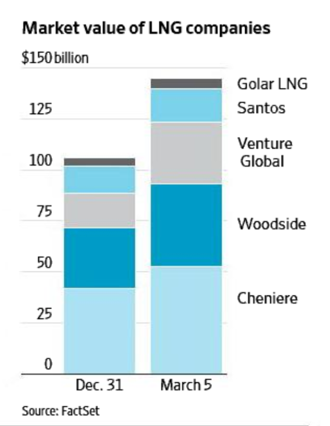 2、因伊朗冲突导致霍尔木兹海峡关闭,市场预期占全球供应五分之一的卡塔尔液化天然气(LNG)出口将受阻,推动五家主要LNG公司的合计市值自年初至3月5日飙升420亿美元,涨幅约40%。此轮上涨基于美国和澳大利亚生产商将填补供应缺口的投机逻辑,但这一市场反应已脱离行业基本面,因为LNG生产商的盈利能力受到长期合同定价机制的严格限制,使其无法完全捕获现货市场的价格飙升,同时其生产设施也缺乏足够的闲置产能以应对短期需求激增。以Venture Global为例,其市值增幅已达到乐观盈利预期增量的五倍,市场情绪与实际潜在收益之间存在巨大差异。