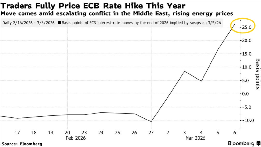 1、金融市场目前已几乎确定欧洲央行将在2026年加息——这与本周初形成戏剧性反转(上周五市场尚有40%概率预期降息)。巴克莱银行利率交易董事总经理露西尔·弗莱特(Lucile Flight)表示: “欧央行的唯一使命是维持物价稳定,在我看来,面对能源价格冲击,他们不会犹豫加息。” 但Futures First Canada分析师里希·米什拉(Rishi Mishra)持不同看法: “市场过于确信欧央行会在一场将严重拖累消费的供应冲击中加息,这可能过于激进。” 宏观策略师文·拉姆(Ven Ram)则指出: “尽管油价和天然气价格飙升确实对德国构成通胀压力,但相比日本和英国——这些国家在战争爆发前就已面临显著通胀——德国要求更高通胀风险溢价的理由要弱得多。”