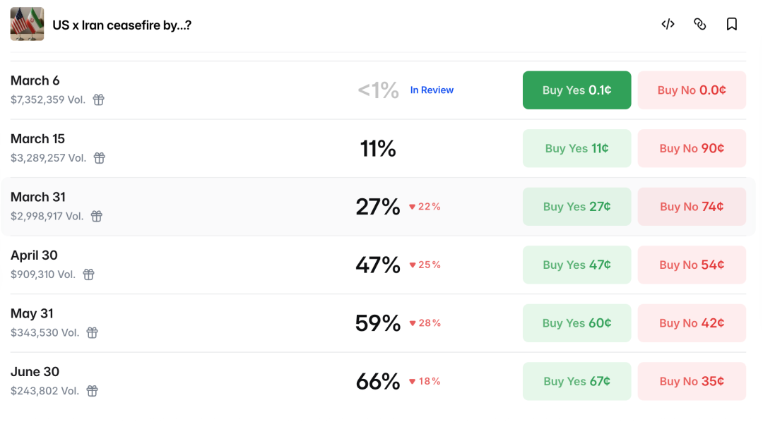 先更新下:目前市场对美伊月内停战的预期只剩1/4。