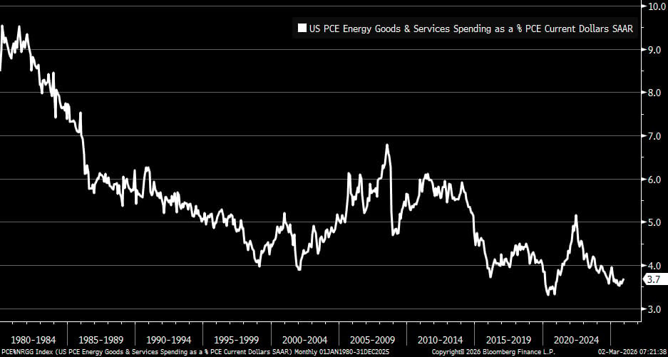 3、美国能源开支占个人消费支出(PCE)的比重已降至3.7%,接近历史最低水平,这意味着油价需大幅且持久上涨才能实质性冲击其经济增长。回顾2022年,该比例曾回升至5.2%,当时并未引发经济衰退,但对通胀构成了显著压力。