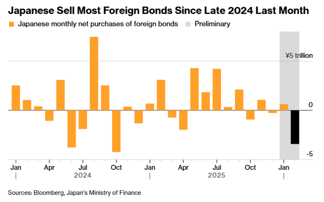 2、根据日本财务省的初步数据,日本投资者于2月净卖出价值3.42万亿日元的海外债券,创下自2024年10月以来的最大月度抛售额。此轮抛售背后,一个可能的驱动因素是寿险公司等机构投资者,因日本国债价格下跌而被迫计提减值损失,进而出售海外资产以平衡整体利润。同时,日本国内债券收益率的攀升,也降低了海外债券的相对吸引力。