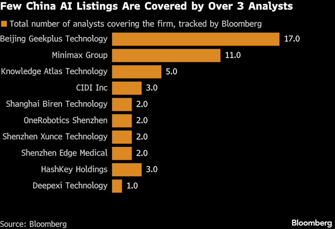 11、尽管中国人工智能公司上市节奏加快,券商的分析师覆盖却出现显著缺口,加大了投资者的评估难度。过去一年在香港上市的27家AI相关公司中,近80%获得的研究覆盖率不足三分之一。例如,上市后股价涨幅超400%的芯片设计公司摩尔线程,至今无分析师追踪;而IPO时涨幅达693%的沐曦集成电路也仅有两位分析师覆盖。不过,一些头部公司正逐渐获得关注,如摩根大通与高盛已开始覆盖Minimax和智谱AI,并预计其在2030年实现盈利。