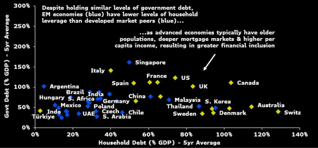 3、尽管部分新兴市场经济体与发达经济体的政府债务占GDP比重处于相似水平,但两者的家庭部门杠杆率存在显著差异。新兴经济体的家庭债务普遍较低,例如巴西、印度和墨西哥等国的家庭债务占GDP比例集中在20%至40%区间,而中国的该比例约为60%。相较之下,发达经济体的家庭杠杆水平则高出许多,例如美国、英国的家庭债务比例在80%左右,而加拿大、澳大利亚和瑞士更是超过了110%。这种差异的根源在于发达经济体通常拥有更成熟的抵押贷款市场、更高的人均收入水平和更老龄化的人口结构,这些因素共同作用,支撑了家庭部门进行更高水平的借贷。