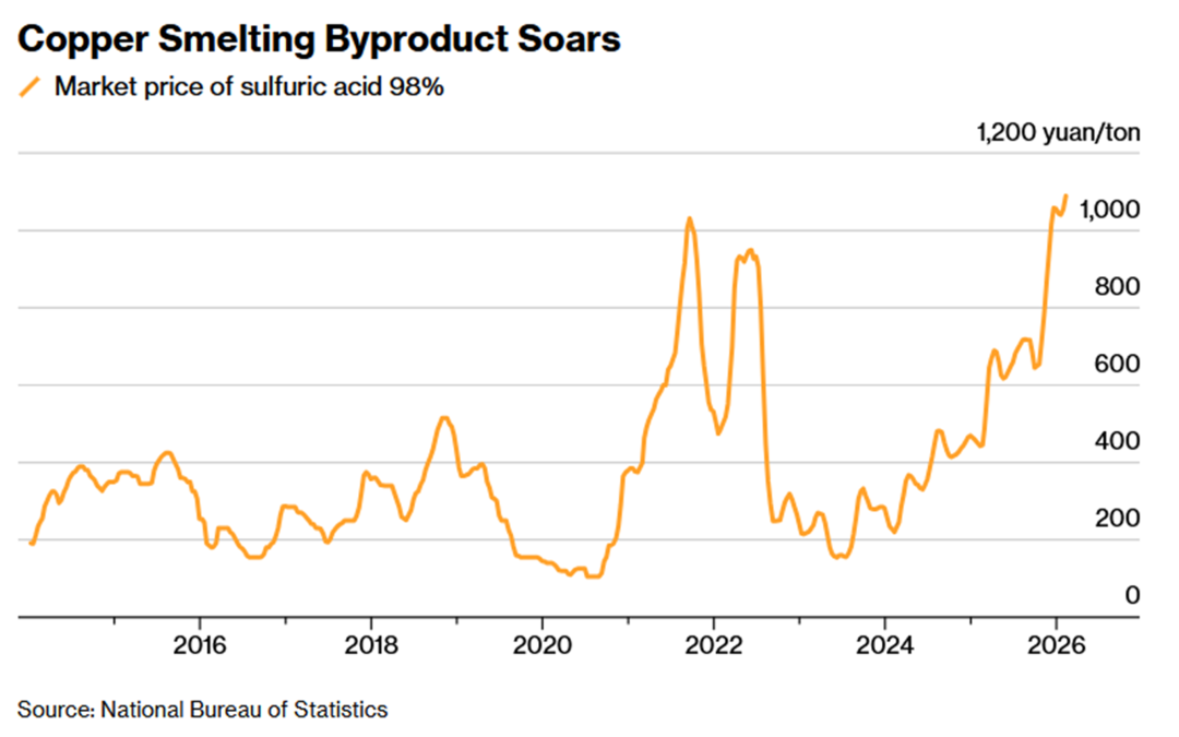 4、中国精炼铜产量正冲击历史新高,预计3月将达近120万吨,这可能导致全球库存激增并对已经高企的铜价构成压力。尽管面临全球矿石短缺,但中国冶炼厂仍通过增加废铜使用量维持了高速生产。与此同时,受俄罗斯硫出口限制与化肥需求强劲影响,冶炼副产品硫酸价格已飙升至逾1000元/吨的十余年高位,显著提升了冶炼活动的经济性。