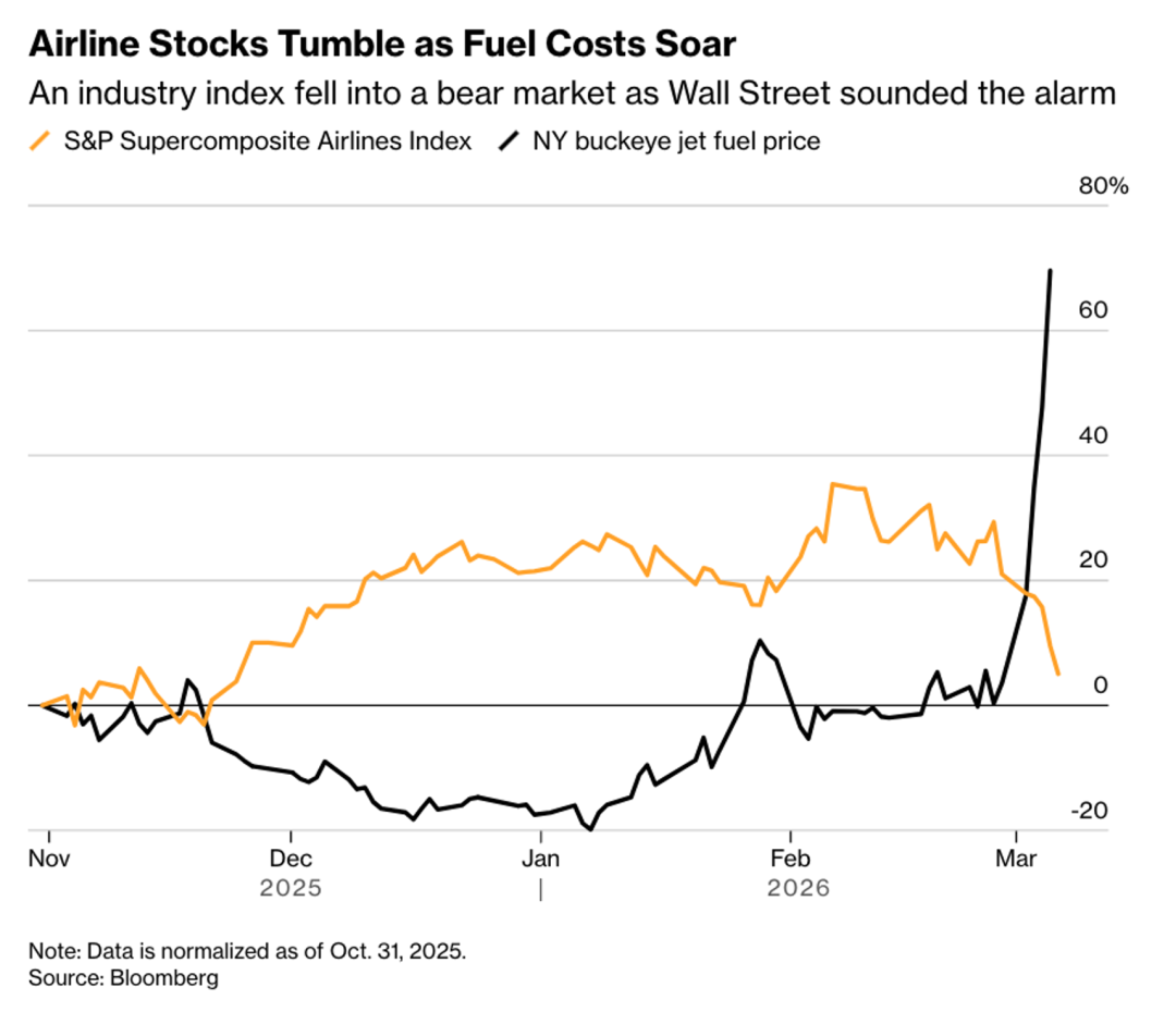 10、受中东地缘政治冲突影响,纽约航空燃油价格在2月底至3月初急剧飙升超过60%,导致标普超级综合航空公司指数迅速逆转了此前数月的上涨趋势,从2月份创下的高点暴跌超过22%,进入技术性熊市区间。燃油成本在美国航司总开支中占比高达30%的经营结构,导致德意志银行等机构将此次价格冲击视为对行业的生存威胁。但是,不同公司的利润受侵蚀程度存在差异,例如杰富瑞测算,燃油价格每变动5%,对达美航空与联合航空的每股收益影响为5%至10%,但对美国航空的影响则高达35%。