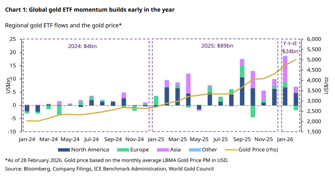 6、世界黄金协会数据显示,全球实物黄金ETF于2026年2月连续第九个月录得资金净流入,当月金额达53亿美元。此轮流入推动全球ETF总持有量增加26吨,达到4171吨的历史新高,同时全球资产管理规模也因金价上涨而升至创纪录的7010亿美元。从区域看,北美市场主导了全球需求,亚洲市场延续稳健流入,而欧洲则成为唯一录得净流出的地区。