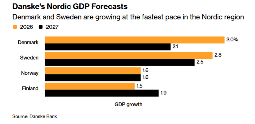 5、根据丹斯克银行的最新经济预测,得益于制药业的持续产出和稳健的国内需求,丹麦2026年GDP增长率预计将达到3.0%,在北欧地区居首。瑞典以2.8%的增长率位居第二,主要驱动力是低于预期的通胀和扩张性财政政策提振了家庭支出。与此相比,挪威今明两年的经济增速预计将维持在1.6%,而芬兰经济在2026年温和扩张1.5%后,预计将在2027年加速至1.9%,但仍面临房地产市场和高失业率的挑战。