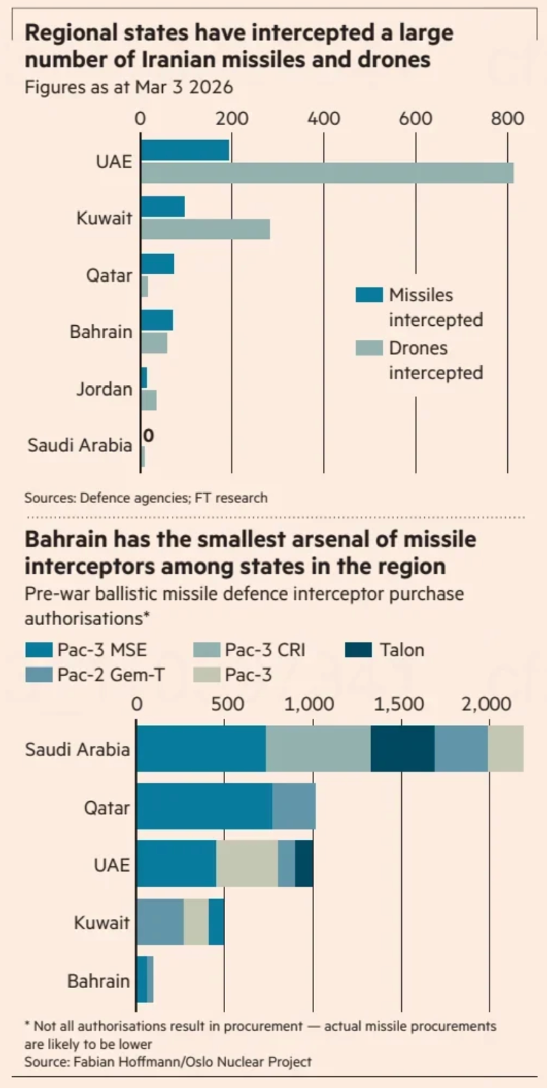 1、为应对伊朗持续的导弹与无人机齐射攻击,部署了美制爱国者及萨德(THAAD)防御系统的海湾国家正面临拦截弹库存急剧消耗的困境,仅阿联酋一国截至3月3日就已拦截了约200枚导弹和800架无人机。然而,由于乌克兰战争已大量消耗西方现有库存,加之国防工业在过去数十年间对此类高精尖弹药的采购投资长期不足,导致美国生产能力出现瓶颈,目前难以迅速满足来自海湾盟友的紧急补充请求。这一攻防态势也暴露了非对称作战的显著成本劣势,防御方需动用价值数百万美元的拦截弹,来摧毁成本仅数千美元的攻击性武器。与此同时,美国对以色列的快速军事援助,包括提供先进拦截系统和空中补给弹药,使海湾国家感受到了在获取美国安全资源方面的优先级差异,加剧了对自身防御能力可持续性的担忧。为打破这种消耗困局,美以正采取攻击发射源的策略,即在伊朗每次发射暴露其阵地时,迅速打击其导弹发射器与储存设施,试图在盟友拦截弹耗尽之前,先行摧毁伊朗的攻击能力。