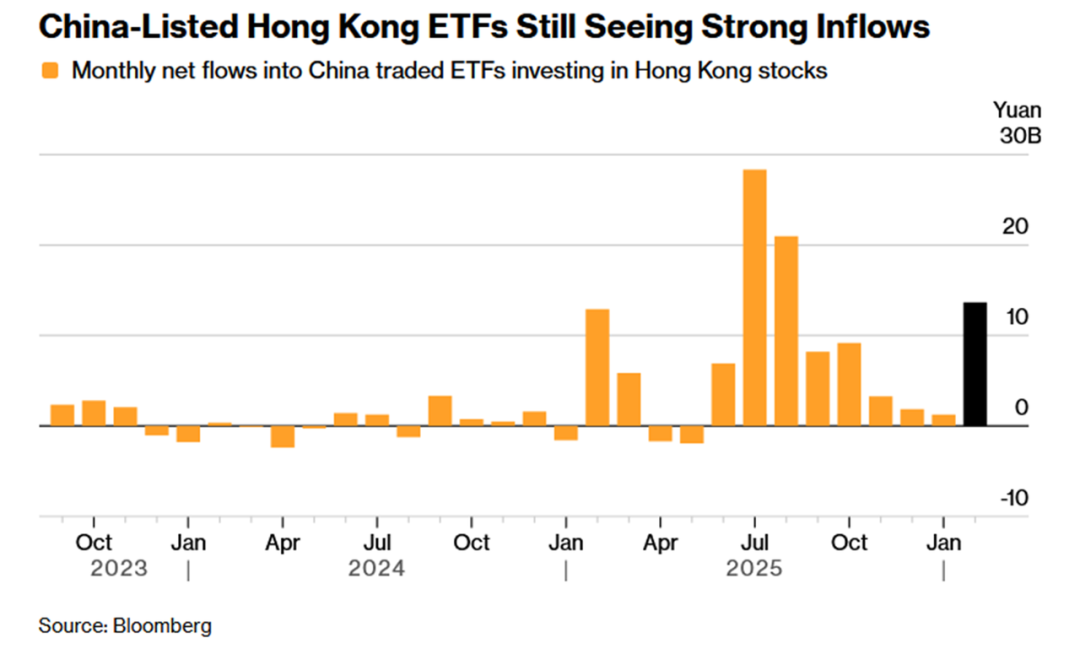 9、尽管港股表现不佳,中国内地投资者在2月通过境内ETF净买入港股的资金规模仍增至137亿元人民币,为2025年8月以来的最高水平。这股抄底资金流主要由无法直接参与港股通的散户投资者构成。同时,香港本地上市的追踪本地股票的ETF在今年前两个月也录得创纪录的59亿美元资金流入。