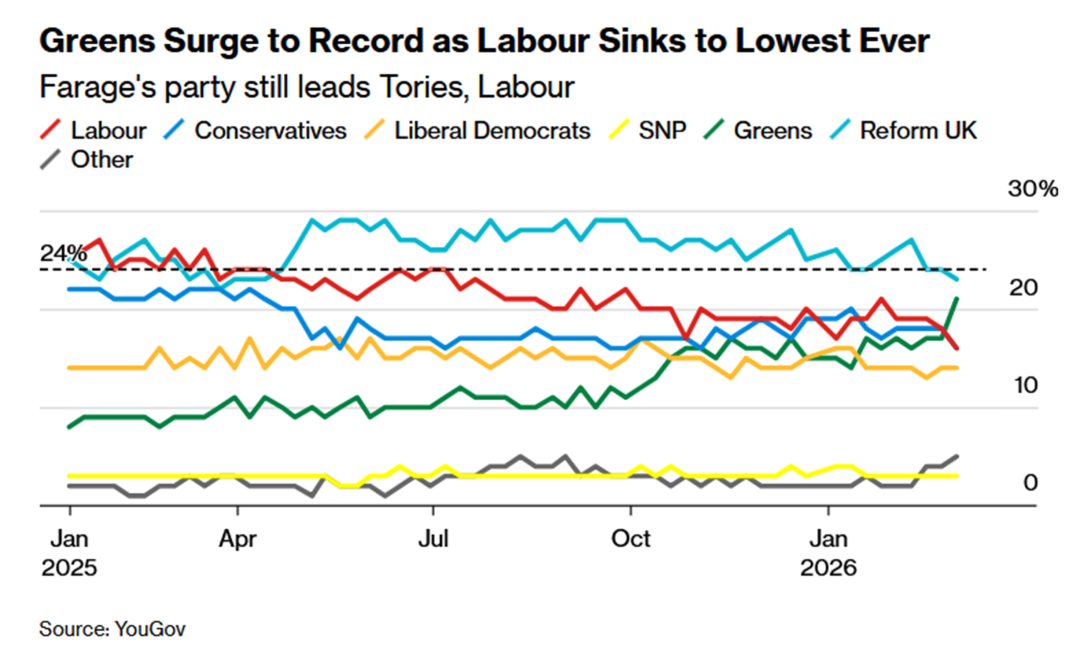 6、英国政坛的传统中间地带正逐步被侵蚀,右翼的英国改革党(Reform UK)与绿党正在取代工党和保守党的地位。根据YouGov发布的民意调查,绿党支持率飙升至21%的历史新高,紧随支持率为23%的改革英国党。与此同时,执政的工党支持率则跌至16%的历史最低点。这两个崛起的政党吸引了背景迥异的边缘化选民群体。改革党的核心支持者集中在经济萧条的前工业城镇和沿海社区,这些地区选民更关注就业、健康和教育剥夺问题,且以婴儿潮一代为主。相比之下,绿党在拥有就业机会但住房成本高昂且污染严重的城市中获得年轻选民的支持,该党目前在50岁以下的所有年龄段人群中支持率领先。同时,一种新的社会动态正在形成,伦敦等城市的高昂租金正迫使倾向于绿党的年轻选民迁往传统上支持改革党的郊区,导致两种截然不同的不满情绪在同一社区并存。这种高度的选民基础碎片化对执政的工党构成严峻的政策挑战,因为单一的经济或社会政策难以同时回应这两种根源不同的剥夺感。
