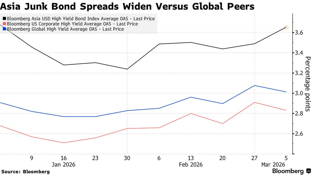 5、由于中东冲突升级暴露了亚洲经济体对进口能源的严重依赖,该地区的高收益美元债券表现逊于全球其他市场。彭博指数显示,本周亚洲垃圾债的平均收益率溢价扩大了16个基点,达到约3.6个百分点,而同期全球及美国同类债券的利差则有所收窄。这种结构性脆弱源于亚洲60%至70%的原油需从中东进口。能源价格上涨推高了借贷成本并对本币构成压力,导致巴基斯坦和斯里兰卡等评级较低的主权美元债券本月以来已至少下跌1.7%,成为表现最差的资产之一。