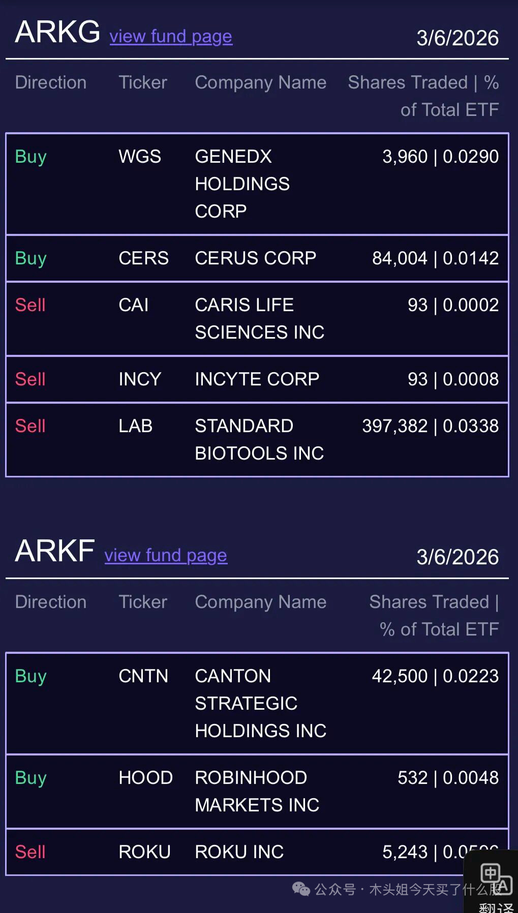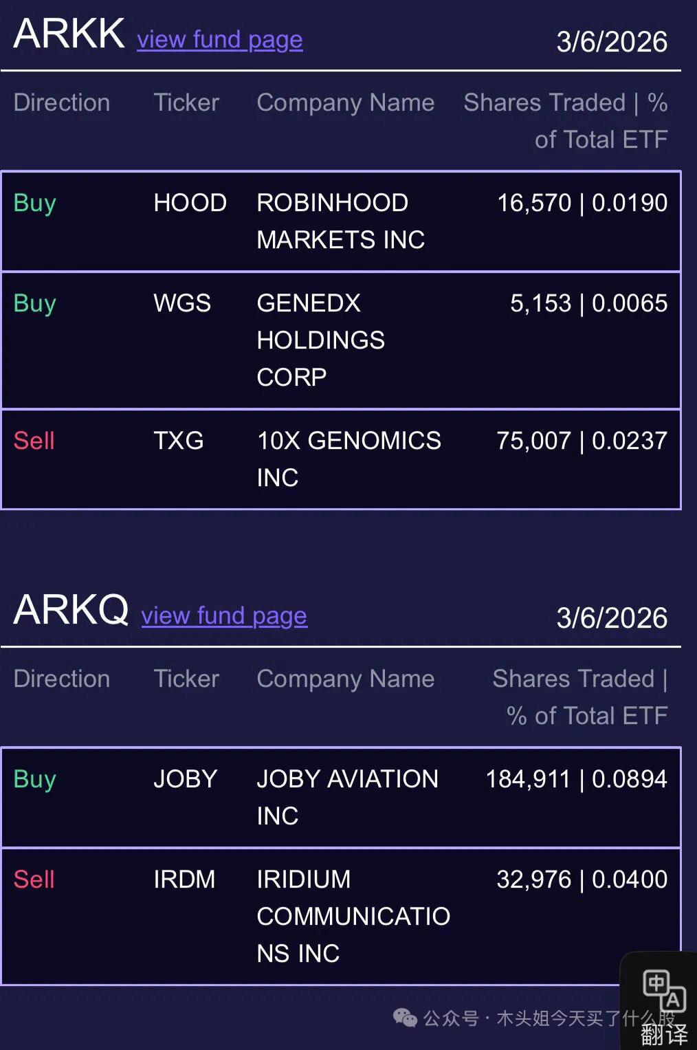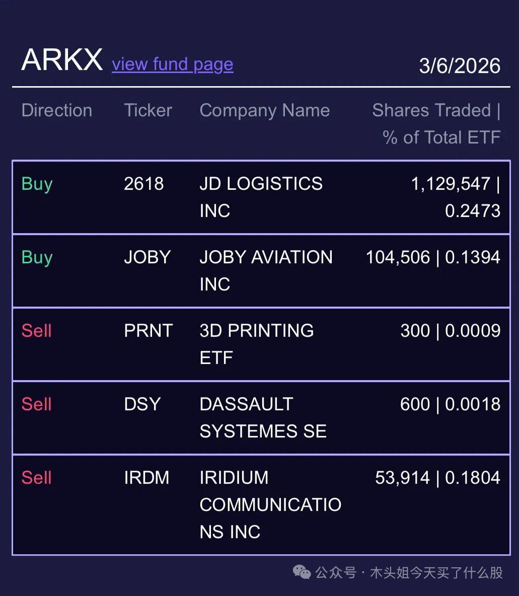 木头姐今天买入150万美元HOOD、80万美金WGS、275万美元JOBY、26万美元DKNG、16万美元CERS、19万美元CNTN、1400万美元京东物流。