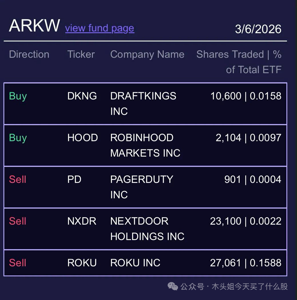 木头姐今天买入150万美元HOOD 卖出2700万美元ROKU