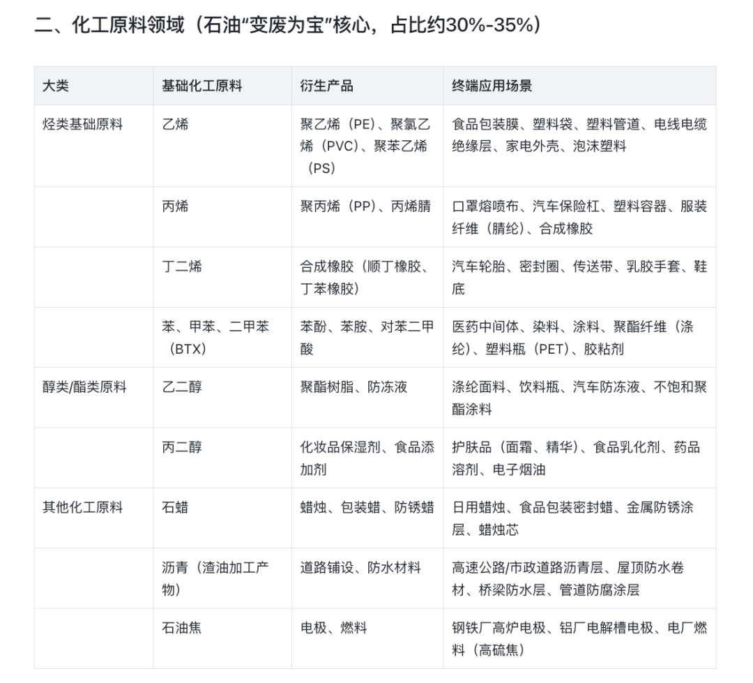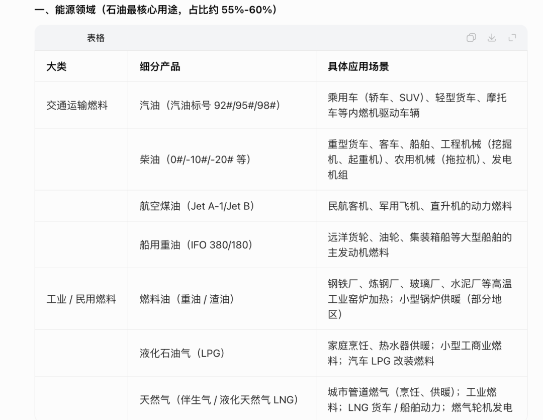 其他的在交通、民生、工业生产、农业等等全部都是石油。石油并非直接使用,需经炼油厂加工为 汽油、柴油、石脑油、重油 等基础产品,再进一步加工为化工原料或终端消费品;核心链条:原油 → 炼油 → 能源产品(燃料)/ 化工原料 → 衍生产品 → 终端应用;占比参考:能源用途(55%-60%)> 化工原料(30%-35%)> 其他(5%-10%,含农业、军事、民生杂项)。