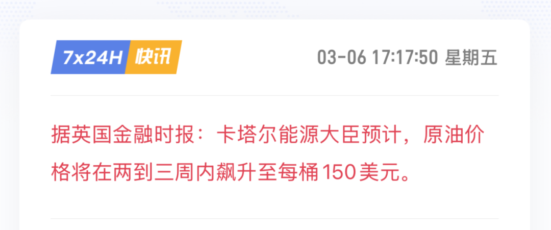 当前已经有能源大臣预计布伦特原油要飙升到150了: