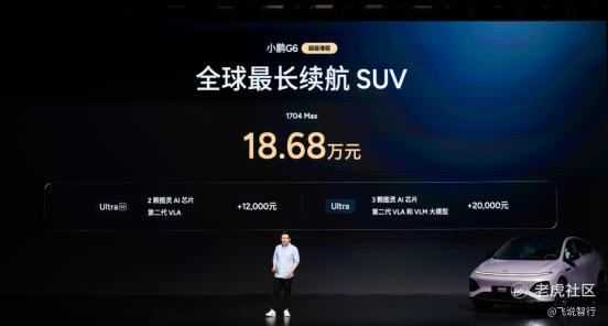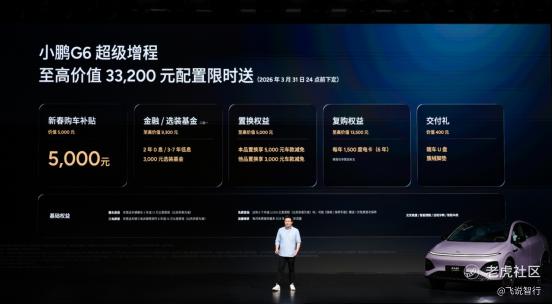 本次发布小鹏G6超级增程1704 Max,官方指导价为18.68万元,用户可选装两个智能升级包,加购12,000元升级为Ultra SE版本、加购20,000元升级为Ultra版本。即日起至2026年3月31日24点前下定小鹏G6超级增程,可享至高价值33,200元限时权益礼包,包括5,000元新春购车补贴、至高价值9,300元金融/选装基金(二选一)、至高价值5,000元置换权益、至高价值13,500元复购权益和价值400元交付礼。
