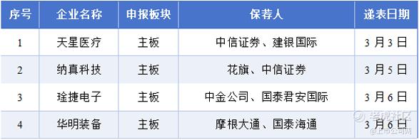 3月1日至3月7日期间天星医疗、纳真科技、琻捷电子、华明装备向港交所递交上市申请,其中华明装备已登陆A股,此次冲击“A+H”两地上市。